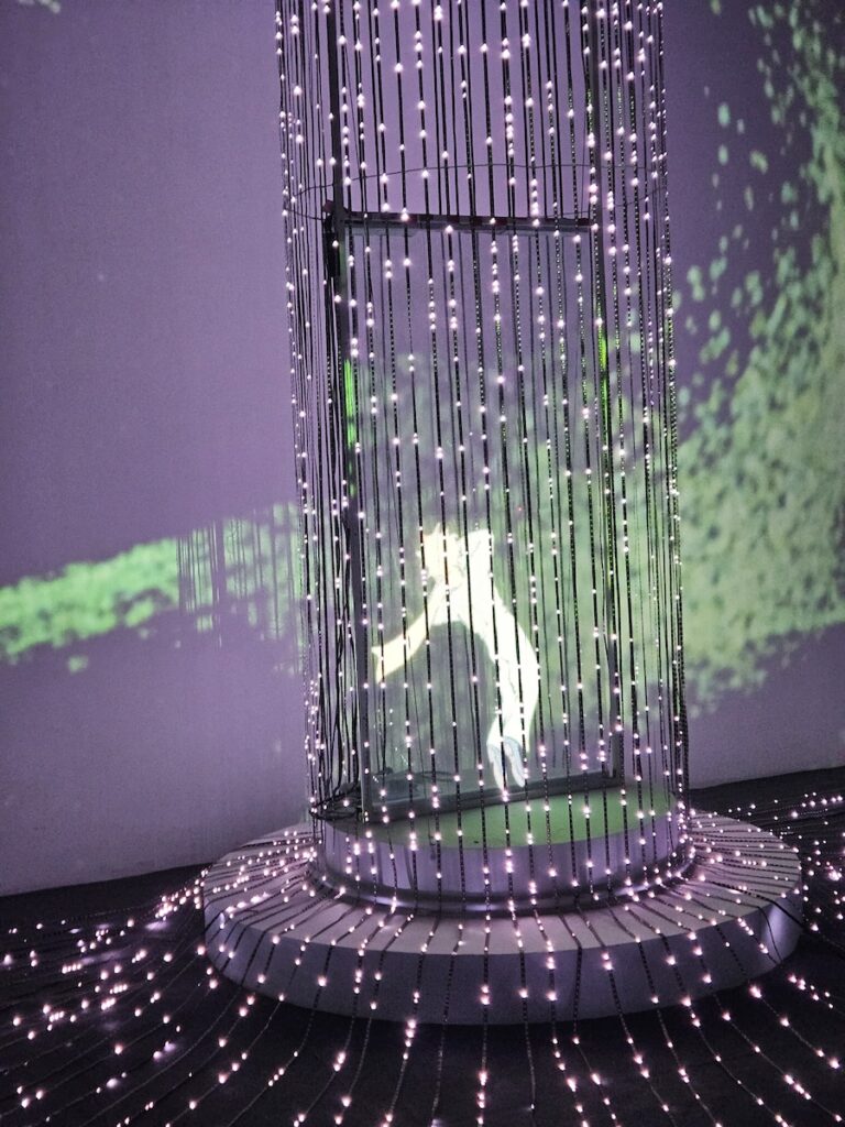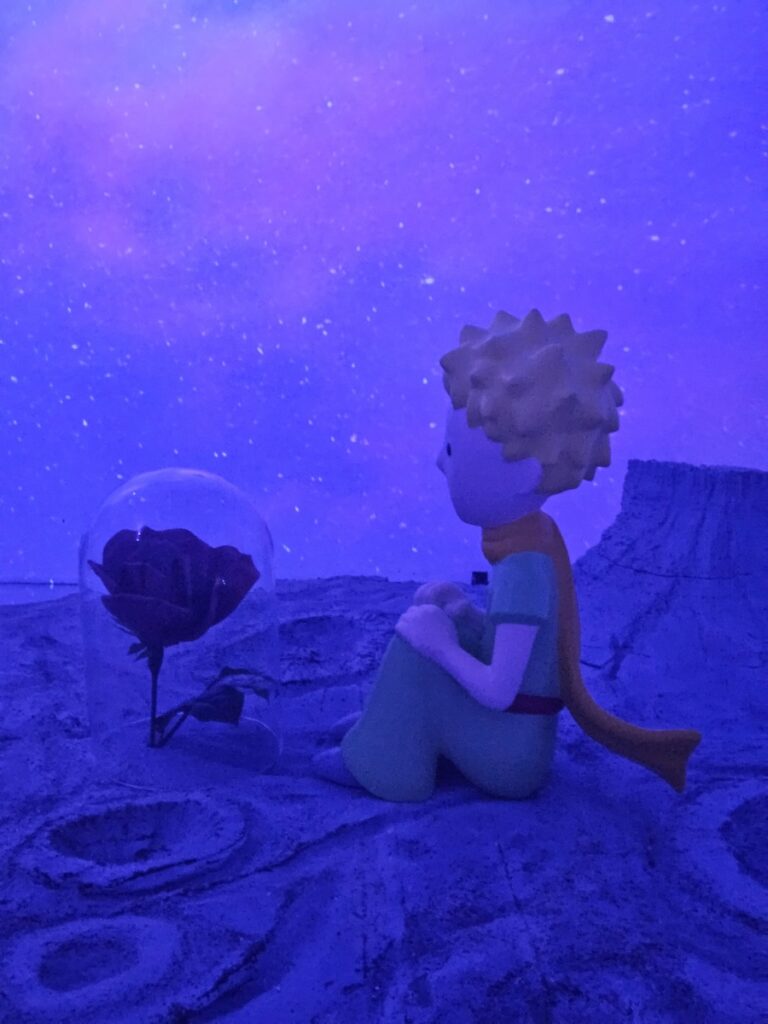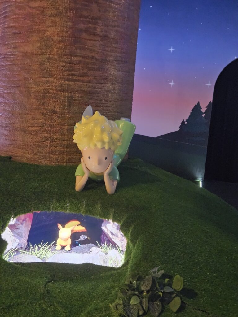 In another room, there was the little prince sitting on his old planet, gazing pensively at his rose under the bell jar that she had asked for to protect her from draughts. With just the star-speckled purple night sky walls all around, it feels like we’re intruding on a private moment between the prince and his rose.