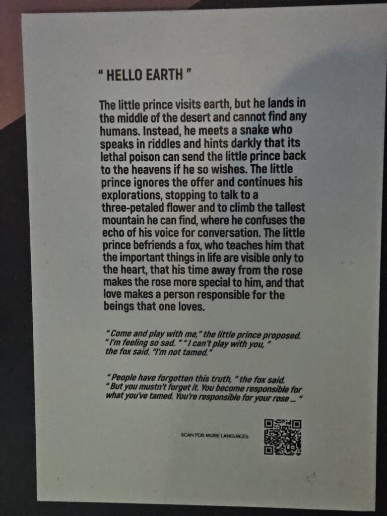 In the first room, you met the little prince standing on the planet he crash-landed on. There’s a fan thing around him so his cape blows in the wind. Then there was a room full of roses from floor to ceiling. It was surreal. Soft cool white lights twinkled among the ceiling roses. There was a special large rose whose petals closed and opened on their own.