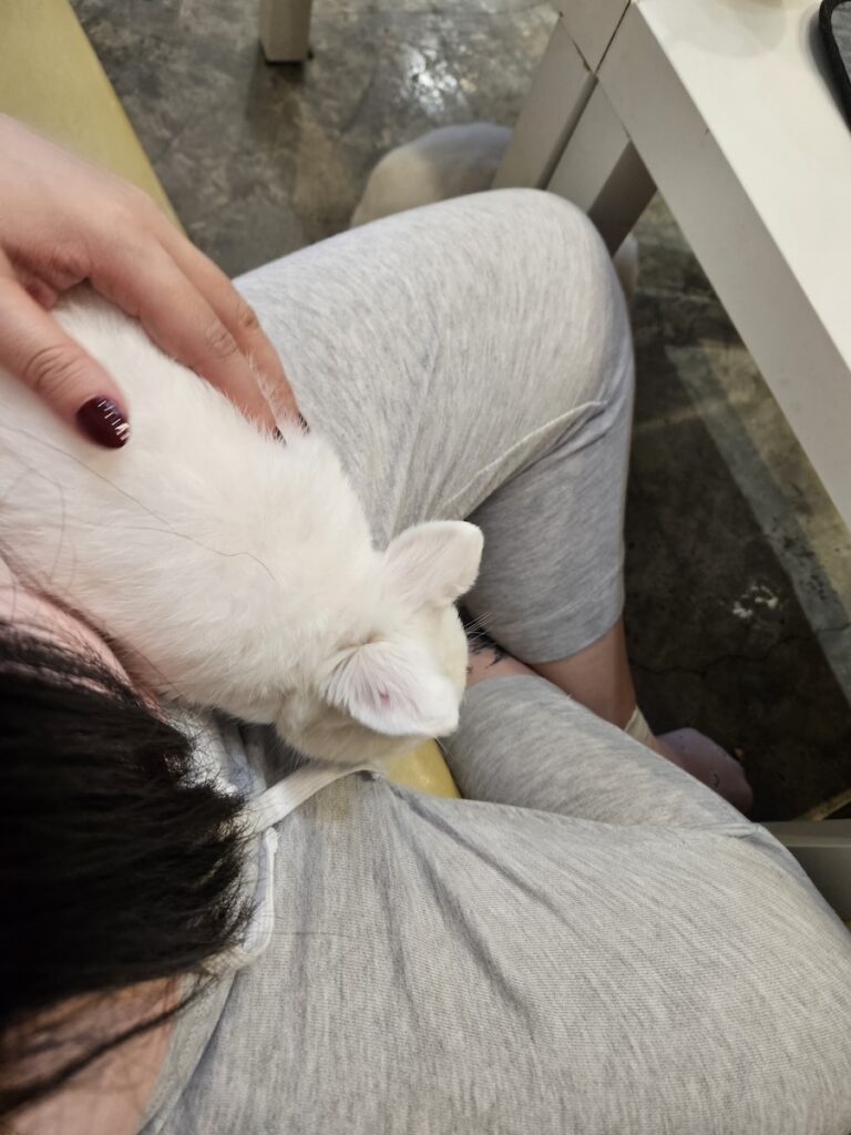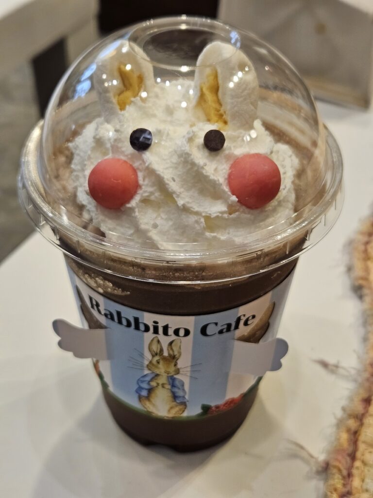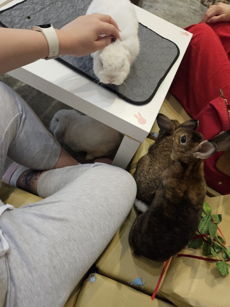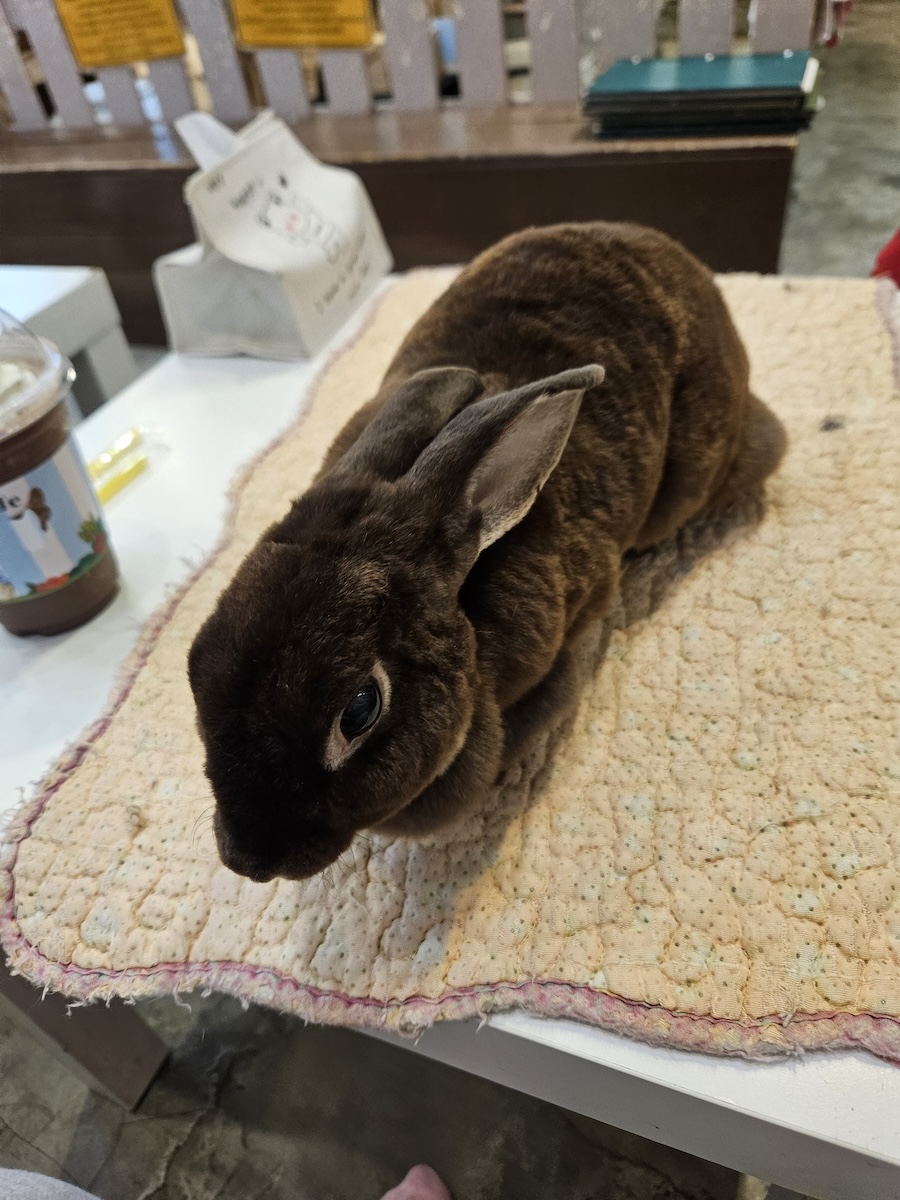 I went to this place called Rabbito cafe. From my understanding, they take in abandoned/dumped rabbits from the streets and post out adoption notices for the bunnies. Upon entering you’ll see a little fenced-off area with hidey houses, a decorative tree stump, etc. with a bunch of bunnies hopping around. Some of the bunnies are in cages but they get let out in turns and also to interact with the shop visitors.